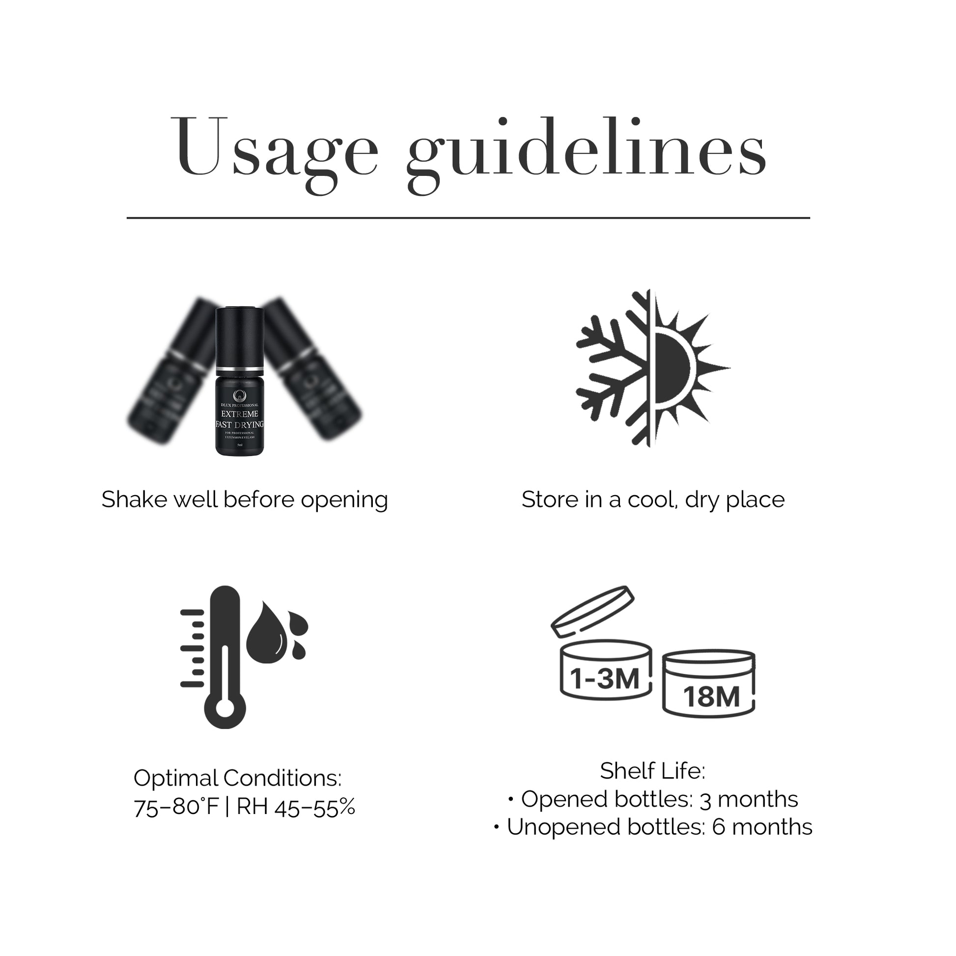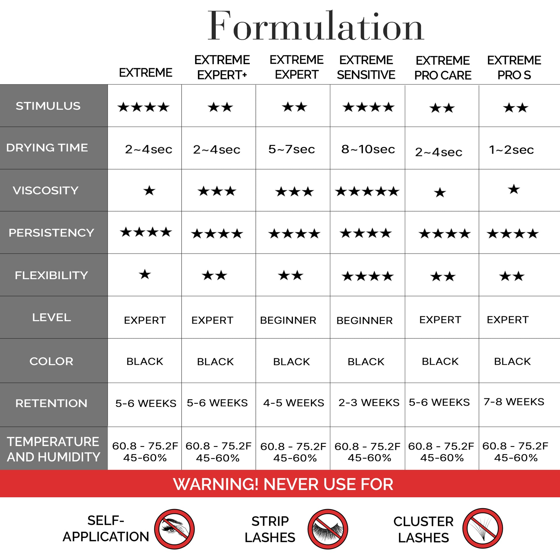 Extreme Line - designed for beginner-expert lash artists. It is a perfectly balanced formula that combines speed, strength and comfort. It provides 5-6 weeks of retention without multiple touch-ups. It also provides a comfortable experience for artists and clients because it was designed with a low-fume formula. With the thin consistency ensures smooth application whether it might be classic or volume.