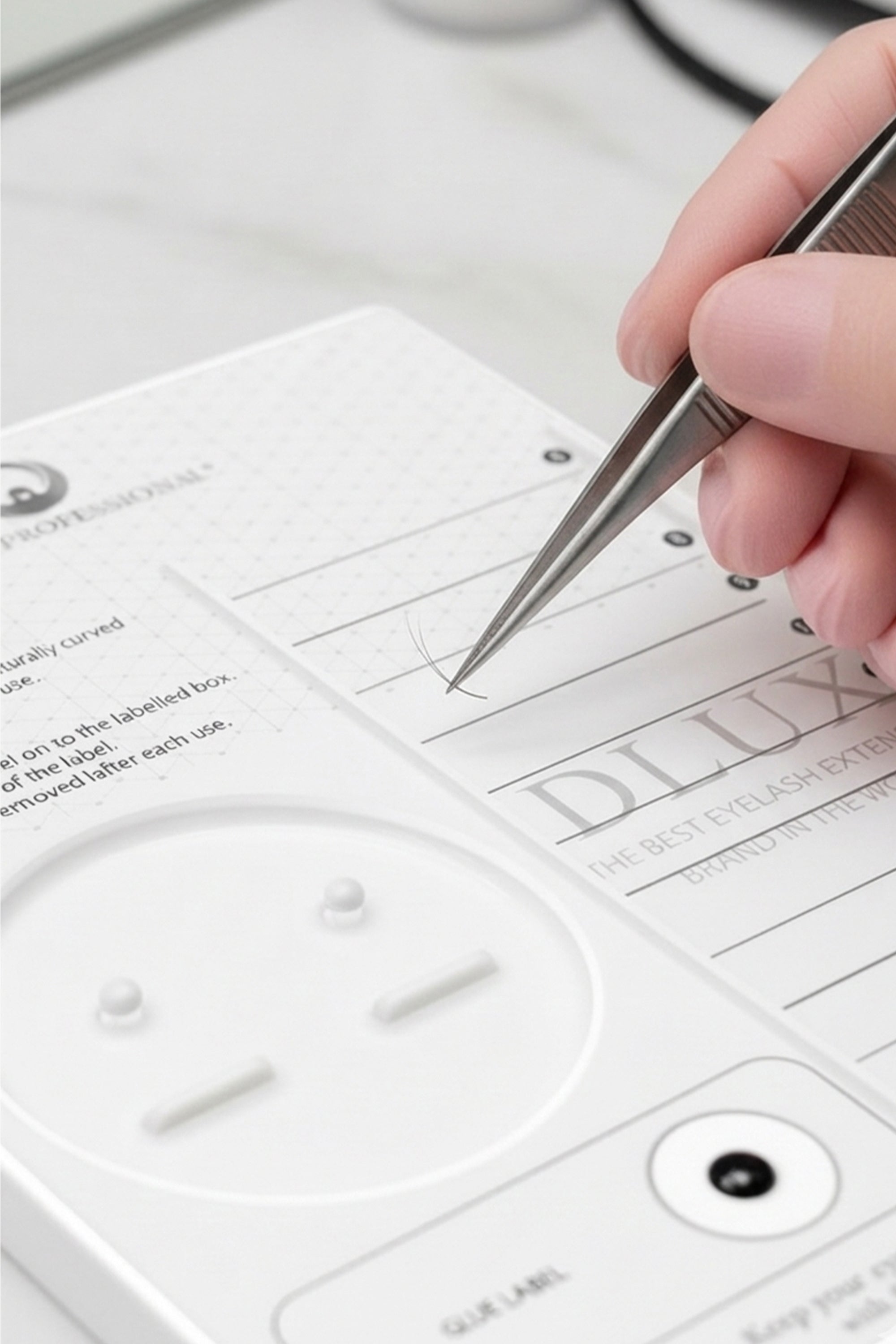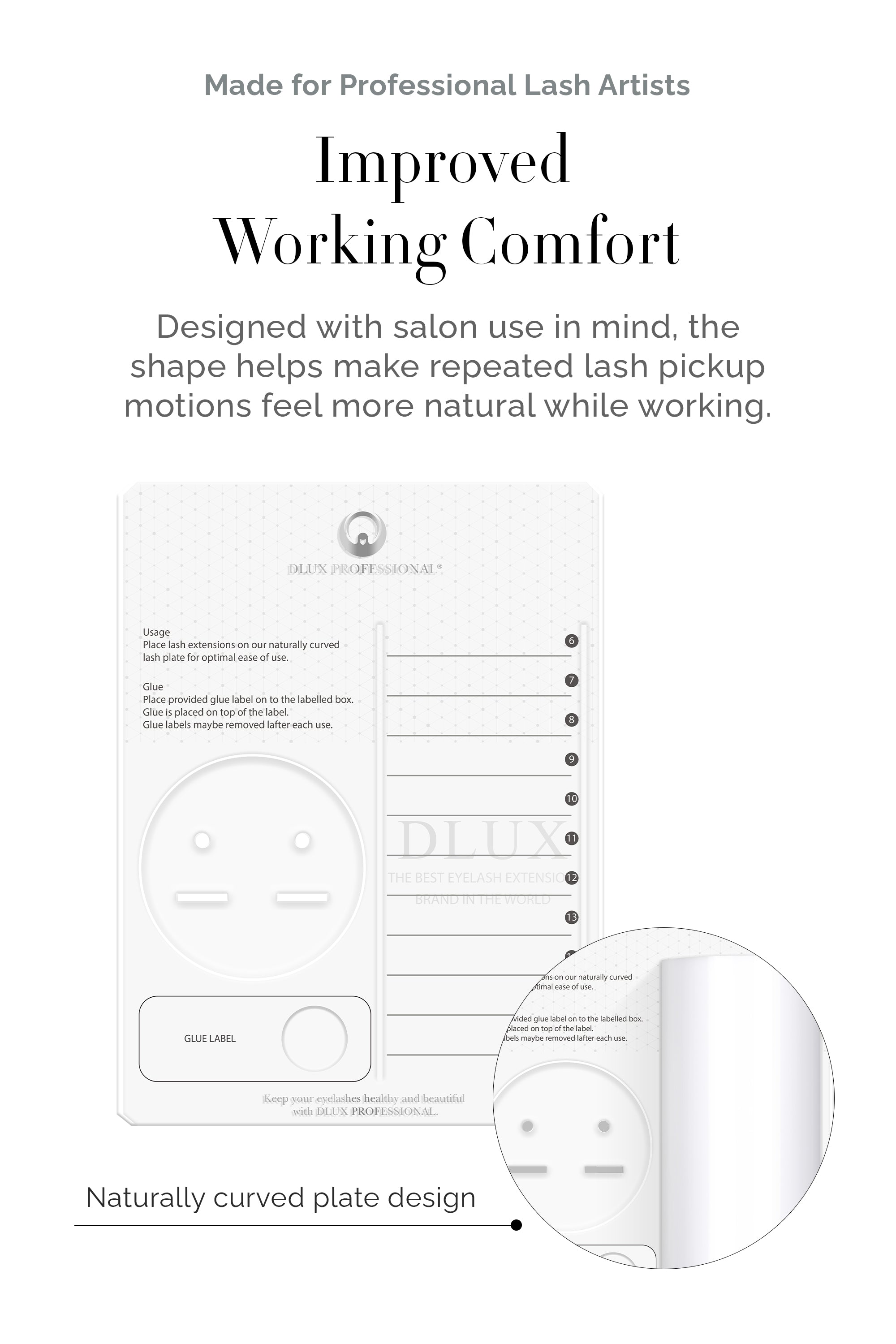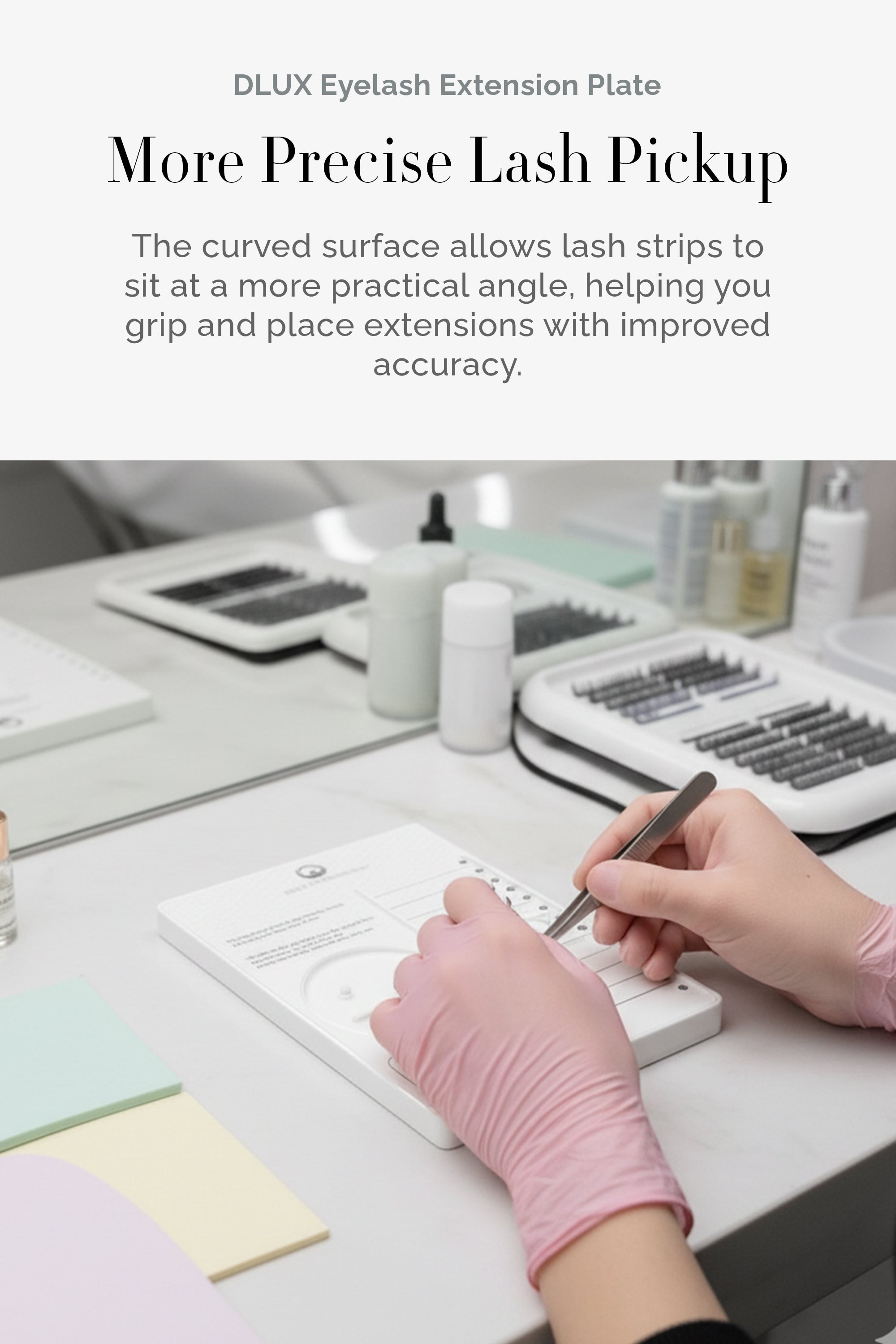 Use the DLUX Eyelash Extension Plate to apply lashes more precisely, quickly, and smoothly. This lash plate's naturally curved design mimics the eye's contours, making it easier to pick up and position extensions. This tool improves your comfort and accuracy while working in a salon.