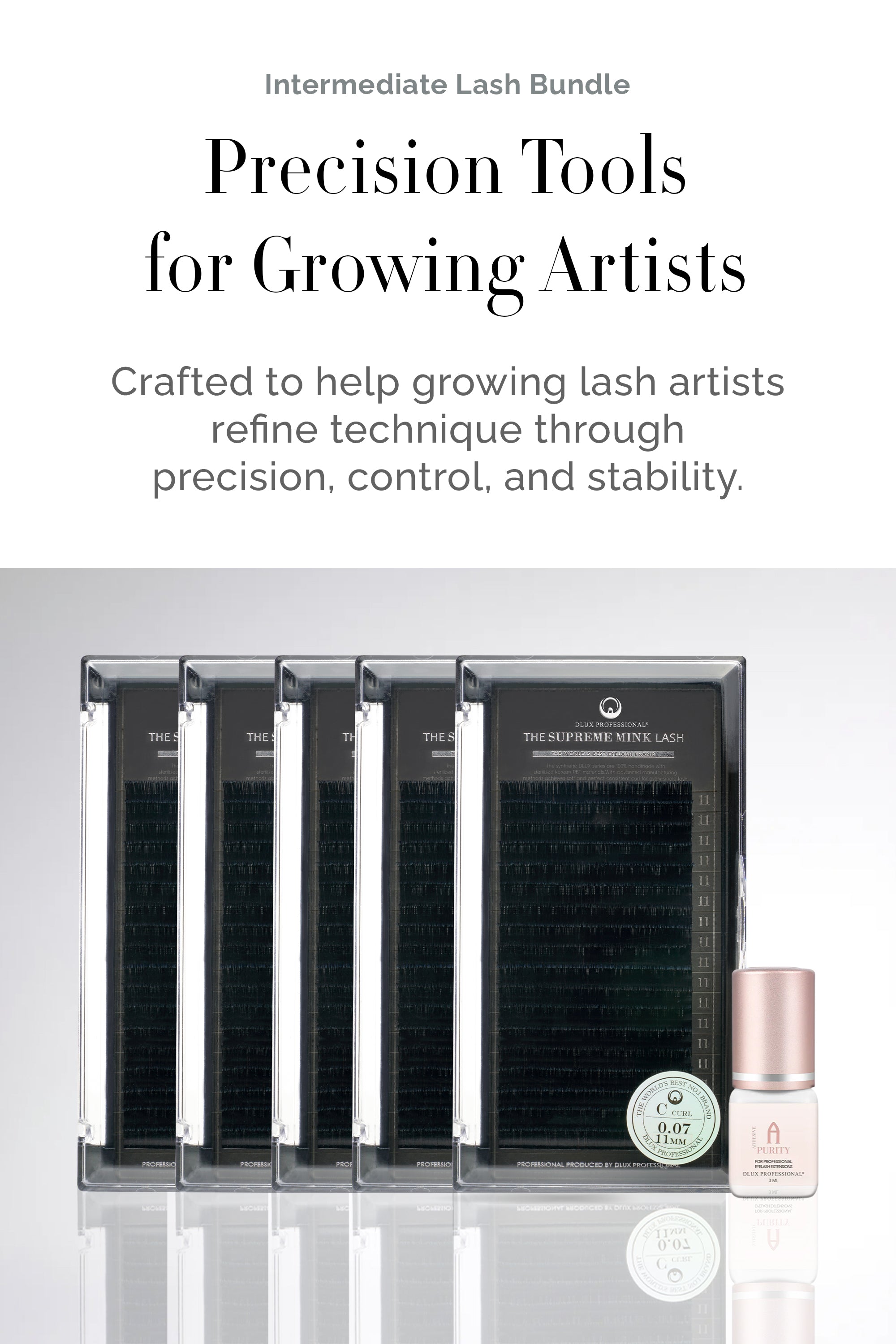 Level up your lashing skills with the DLUX Professional Intermediate Lash Bundle – the perfect balance of speed, control, and quality. This set includes 5 pairs of ultra-soft lash extensions and our best-selling Alpha Purity 3ml Lash Glue, known for its fast-drying and long-lasting hold.