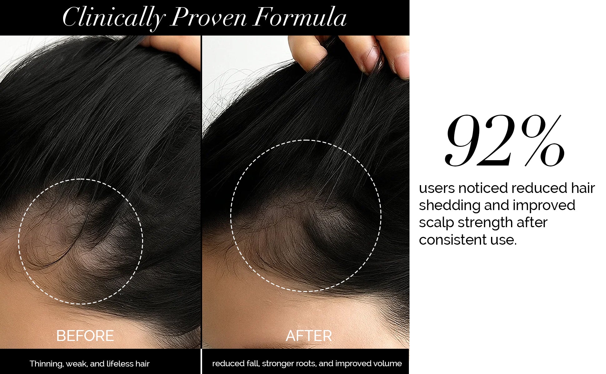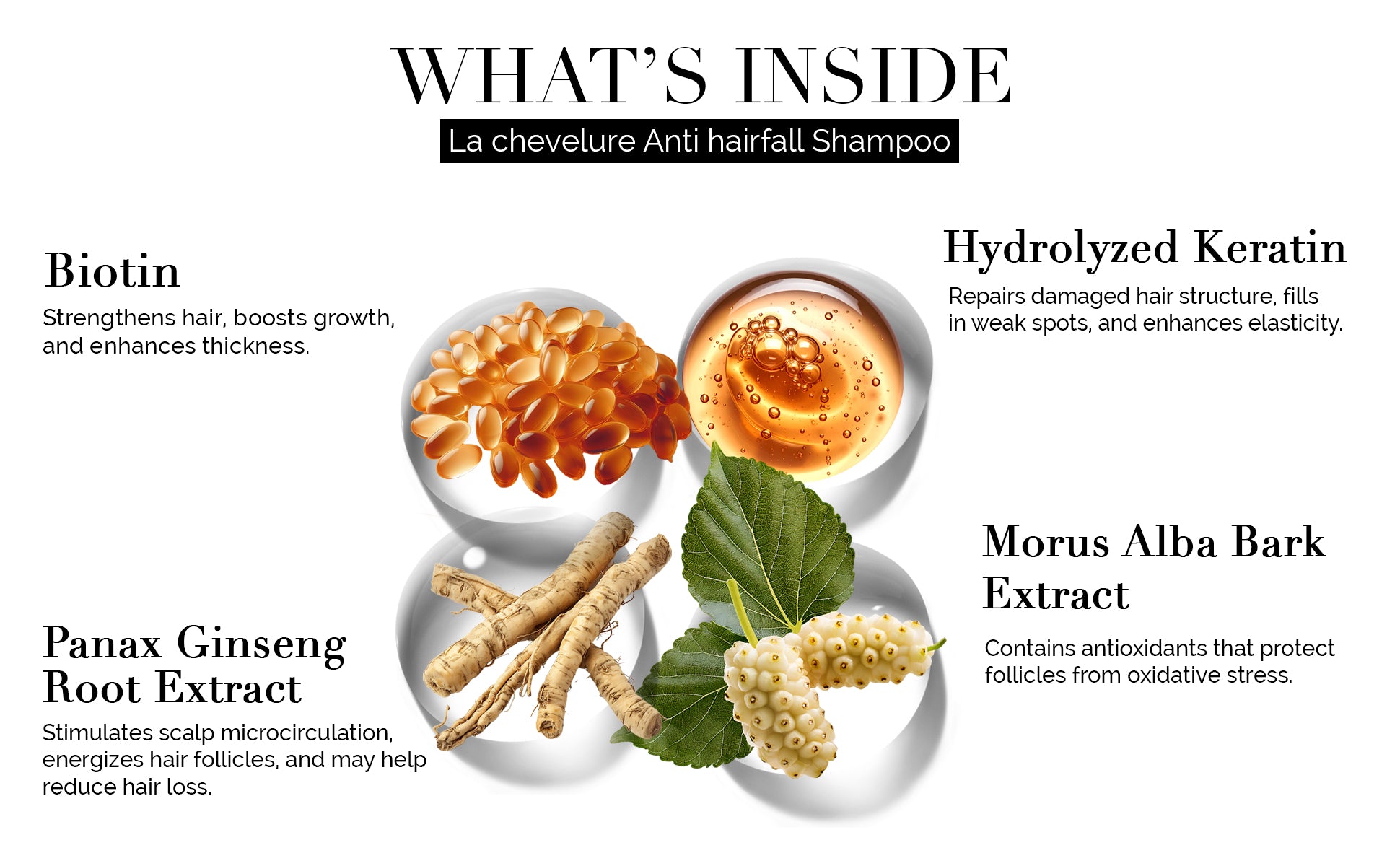 Biotin fuels keratin for thicker, healthier hair. Hydrolyzed Collagen cushions the hair shaft with amino acids our hydrolyzed collagen shampoo to repair weak hair—while this hydrolyzed collagen scalp strengthening shampoo reduces breakage. Morus Alba Bark acts as a morus alba scalp calming shampoo for hair growth, easing dandruff and oil. Panax Ginseng Root Extract energizes hair follicles and scalp circulation for visible regrowth.
