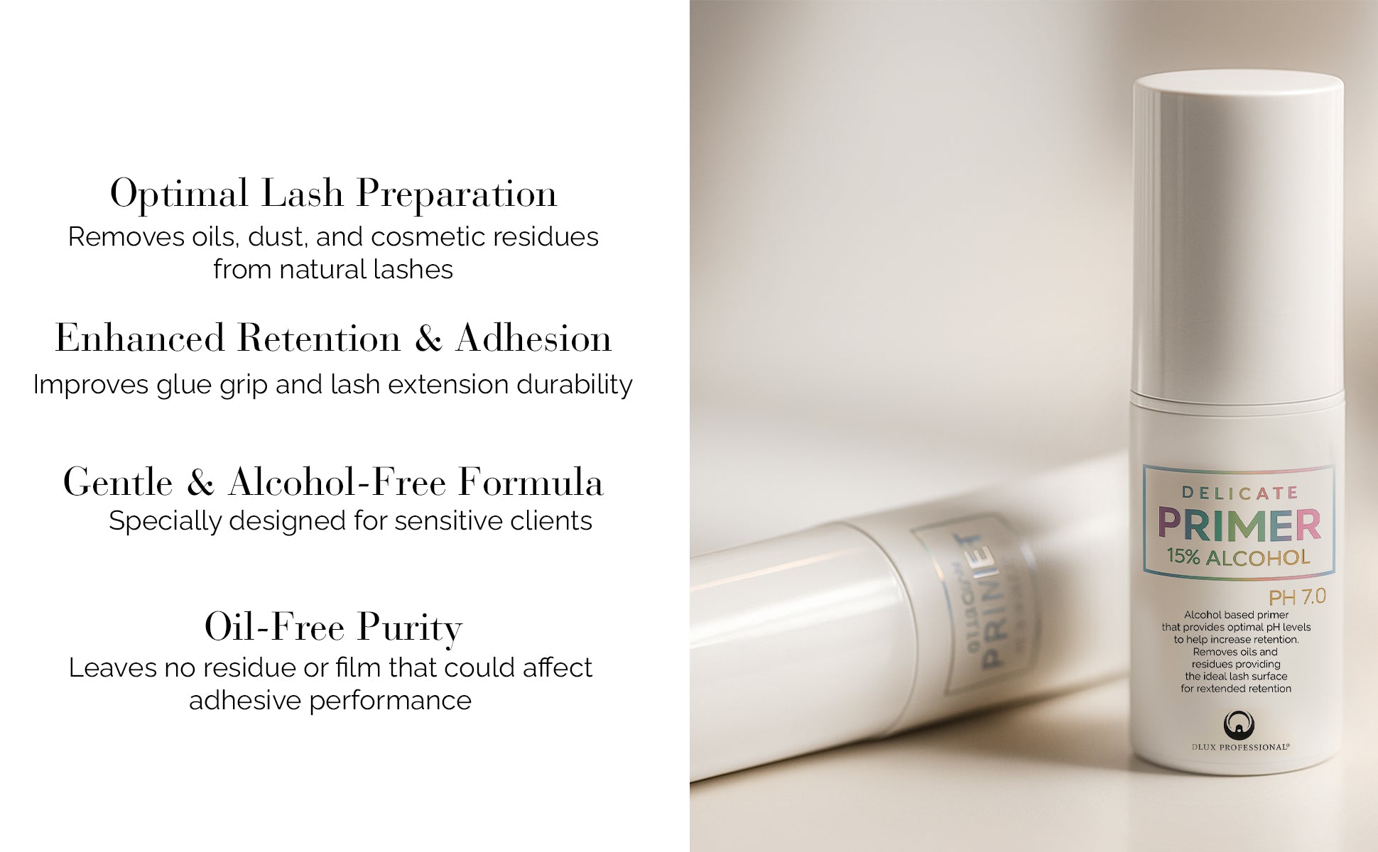 - Optimal Preparation: DLux Professional's Lash Primer Delicate Alcohol-Free prepares your natural lashes for the best possible application of extensions by removing any residual cosmetics or oil.