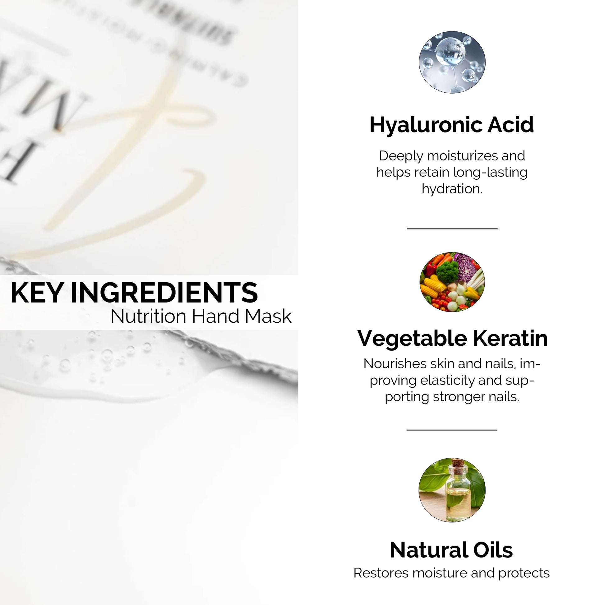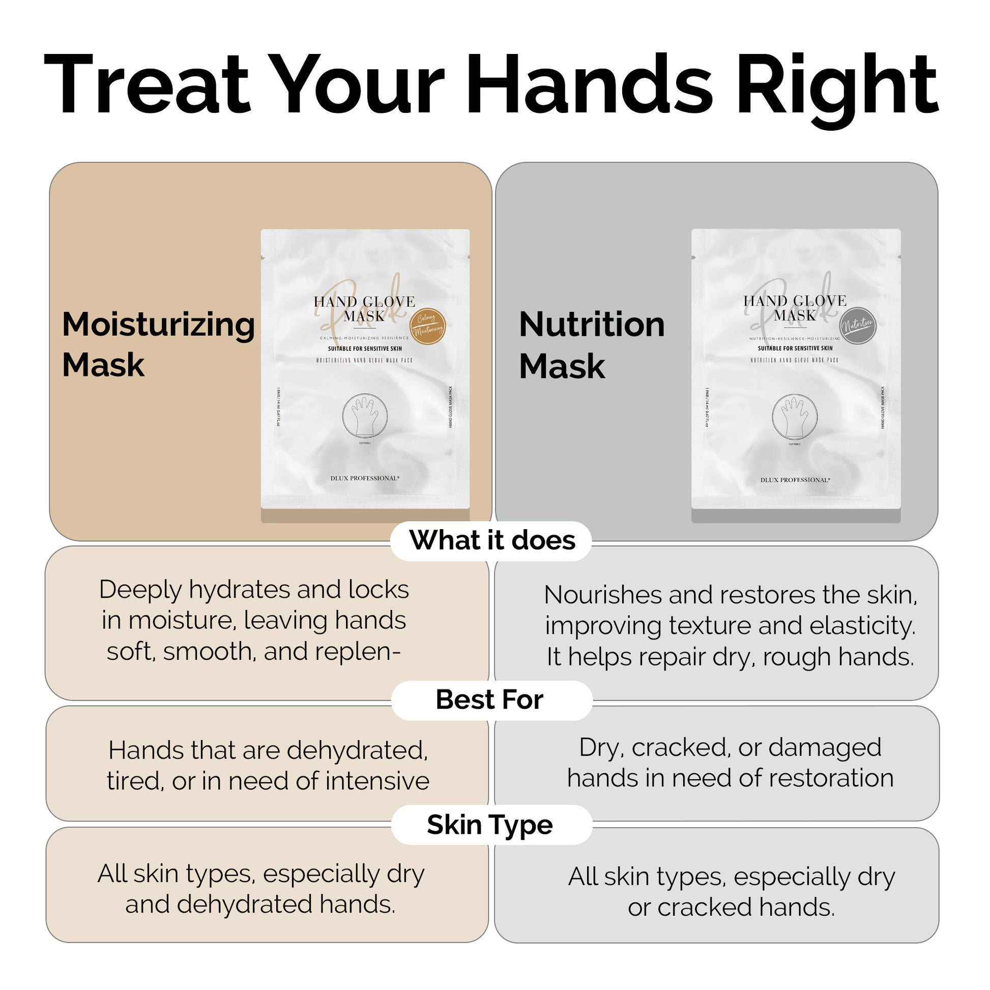 Goodbye, wrinkled and dry hand! DLUX Professional Nutrition Hand Glove Mask, your ultimate solution for cracked, rough, and dry hands. Infused with hyaluronic acid molecules, this deeply moisturizing glove mask promotes skin nourishment, improves elasticity, supports cell regeneration, and helps retain moisture for long-lasting hydration. Enriched with vegetable keratin, a vital protein for skin and nail health, it not only softens and smoothens your hands but also encourages the growth of stronger, healthier nails. Designed to calm irritated skin, these gloves help restore natural oils and moisture lost from frequent handwashing, sanitizers, and harsh soaps. Formulated to be gentle and safe for all skin types—even sensitive hands suffering from wrinkles, dullness, or dryness. Made with premium, professional salon-quality ingredients, these glove masks deliver spa-level results whether you're using them at home or in a salon. Experience soft, youthful hands—without the hassle.
