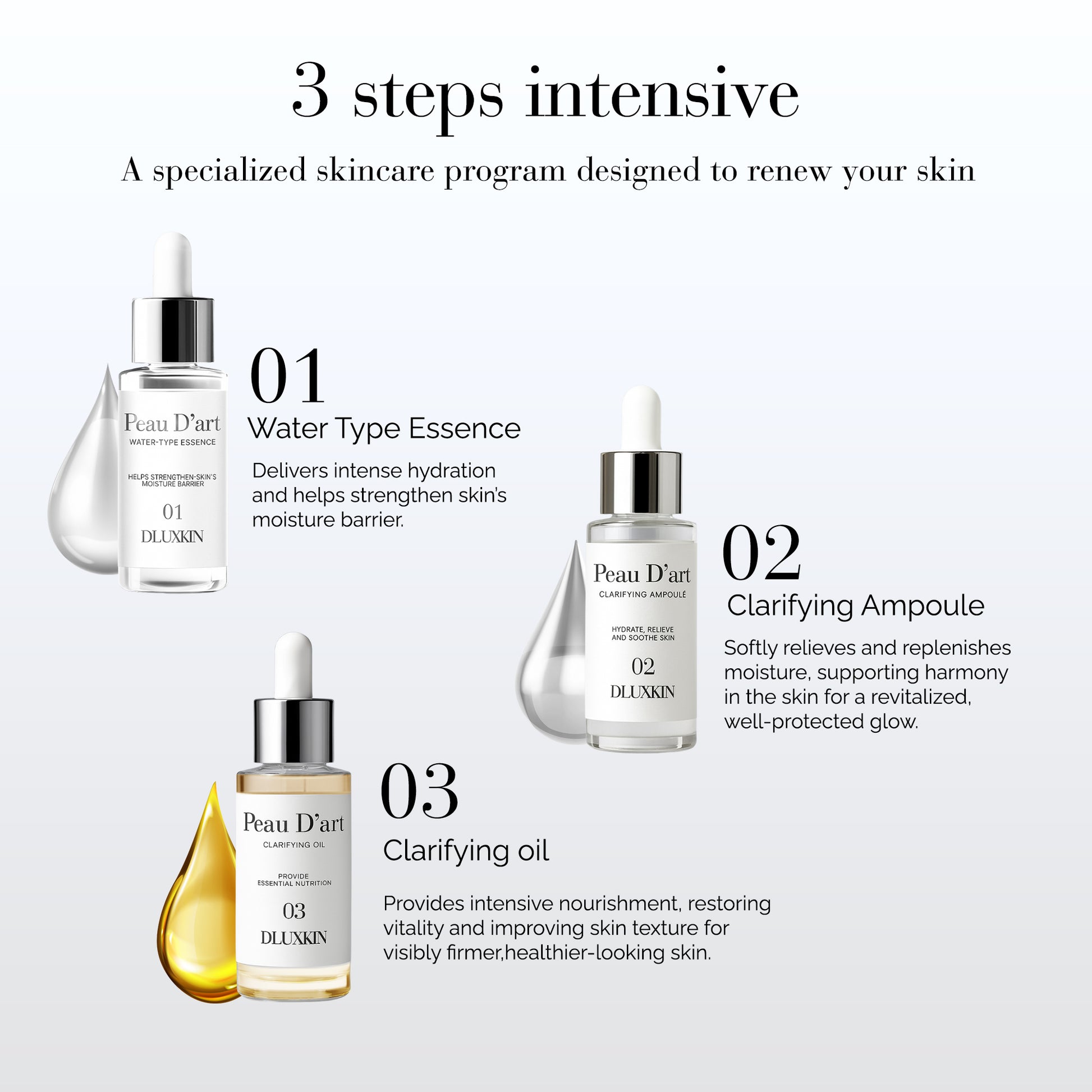 Introducing Dlux Peau D’art Selections a groundbreaking 3-step intensive skincare program designed to address specific skin concerns and restore your skin's natural vitality. With over 20 years of dlux expertise, this regimen effectively solves common skincare problems, providing visible improvements in firmness and overall skin health.