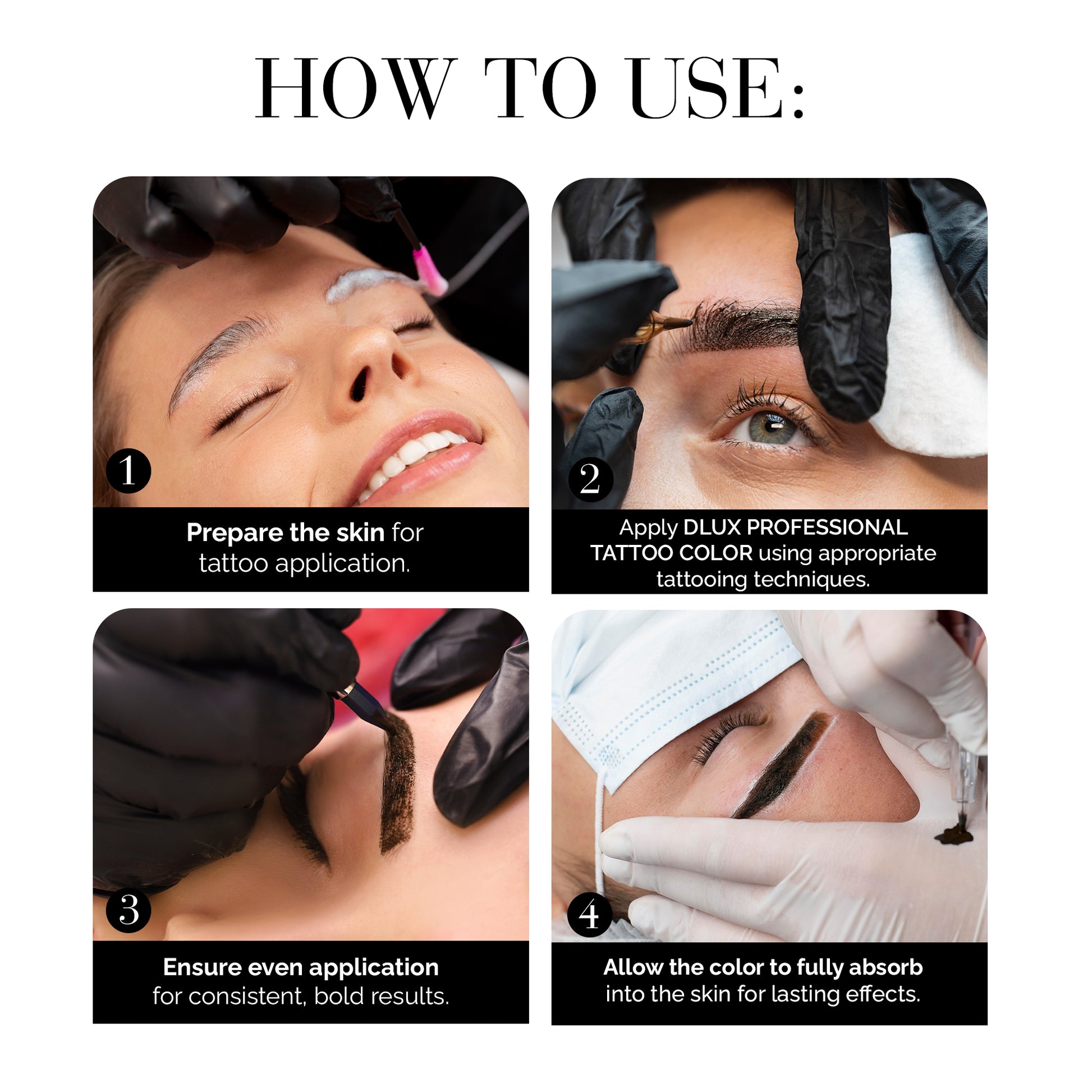- Apply DLUX PROFESSIONAL TATTOO COLOR using appropriate tattooing techniques.